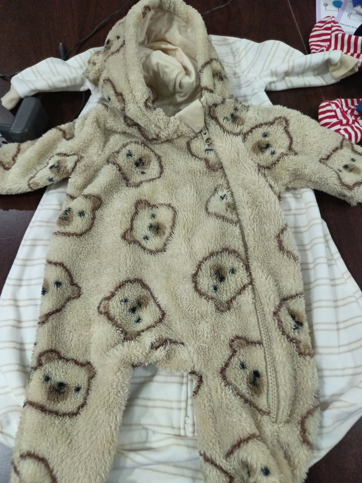 Kürklü detaylı, ayı desenli yumuşak kumaştan yapılmış bebek tulumu. Kapüşonlu ve fermuarlı, gri-kahverengi tonlarında.