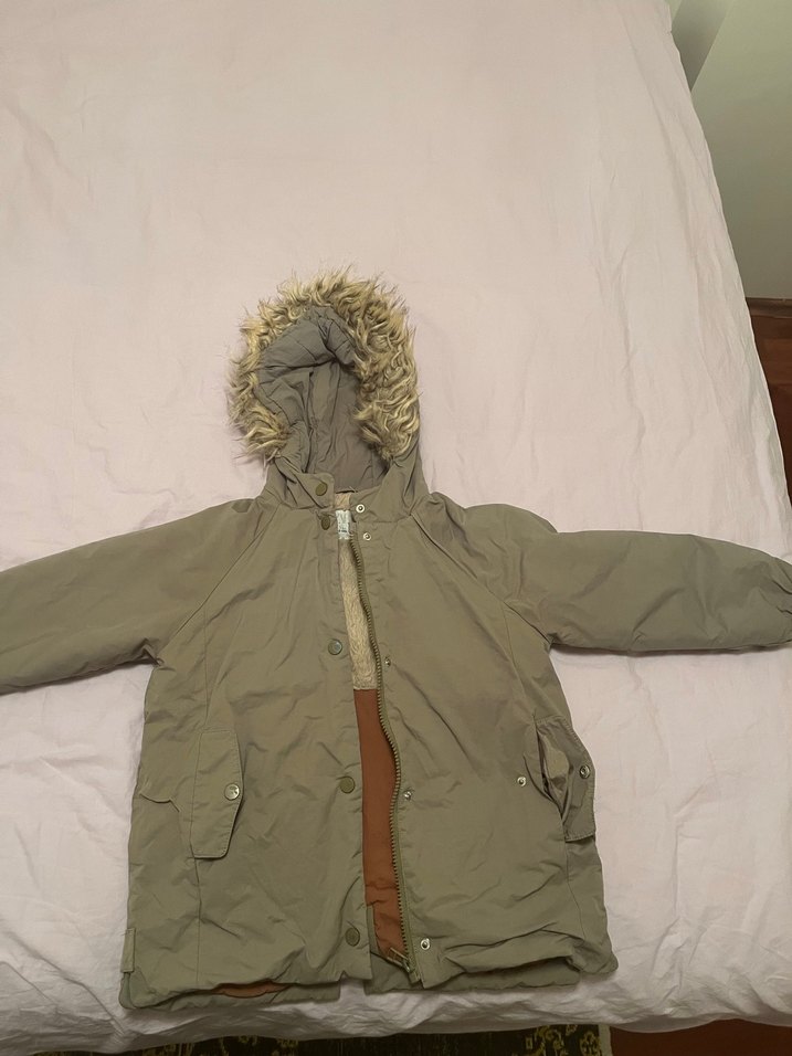 Kürklü kapüşonlu, bej renkte, yumuşak ve sıcak kumaştan yapılmış, dar kesim erkek çocuk kabanı. Düz ve sokak stiline uygun. Renk solması yoktur.