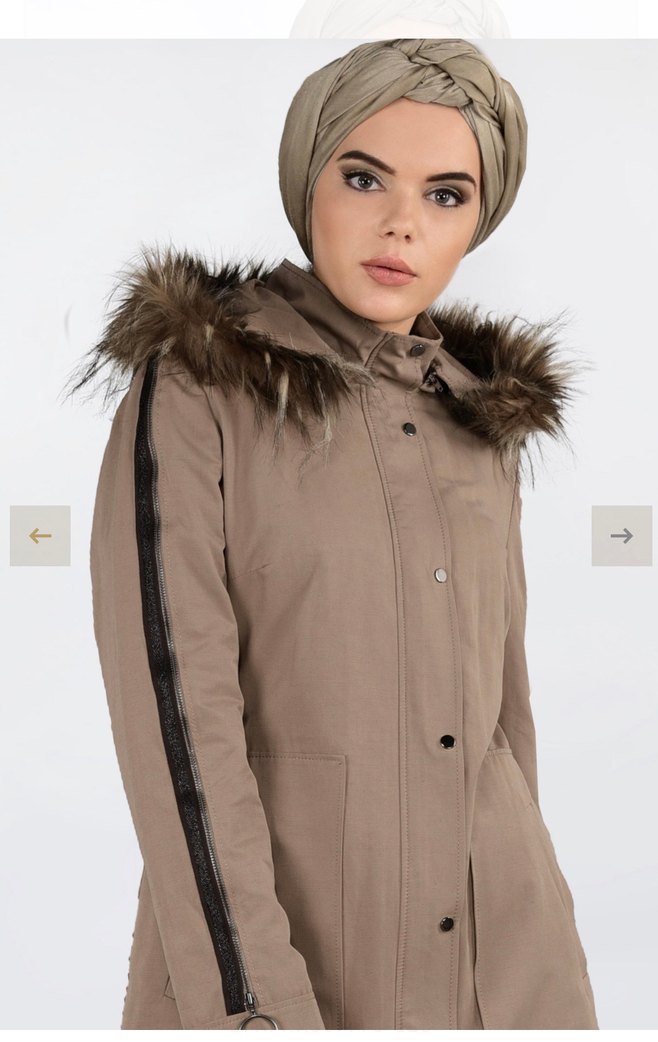 Kürklü kapüşonlu uzun bej kabanı, dar kesim ve pamuk kumaştan üretilmiştir. Uzun kollu ve kesimli yakaya sahiptir. Az kullanılmış herhangi bir deforme ya da lekesi yoktur