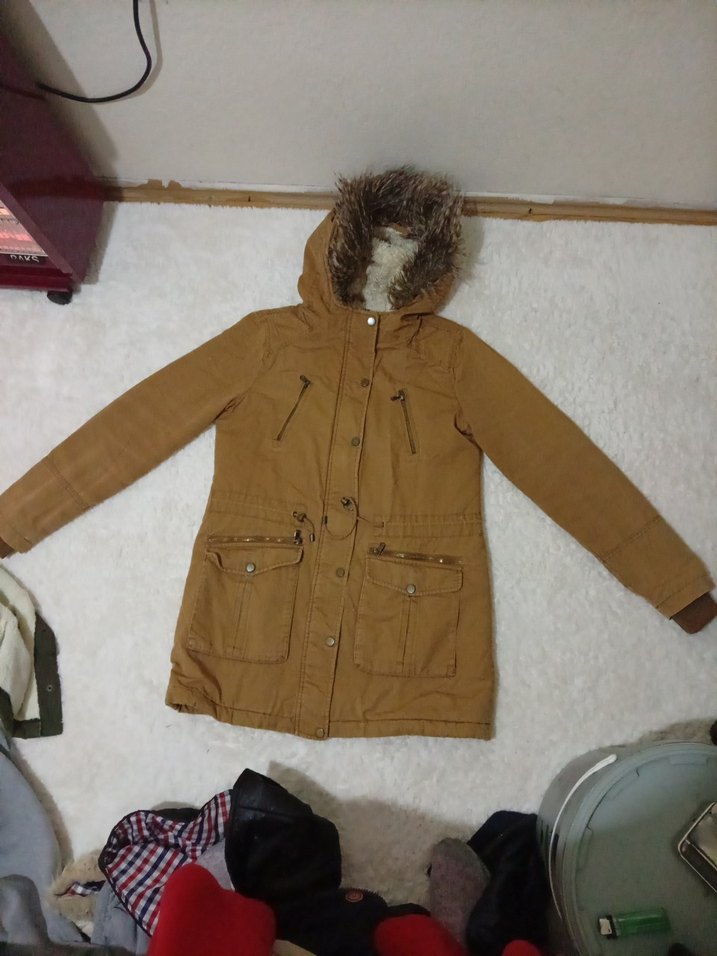 Kürklü kapüşonlu, uzun kollu, bej renkli, fitted kesim, orta uzunlukta kadın kışlık mont. Rahat ve sıcak tutan kumaştan, sokak stiline uygun.