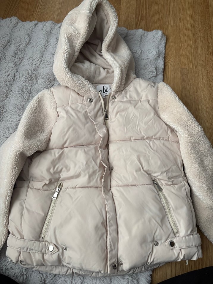 Kürklü detaylara sahip kapüşonlu, uzun kollu ve normal boyda bej kadın mont. Yumuşak kumaşı ve fitted kesimiyle rahat ve şık bir sokak stili sunar. İki fermuarlı cep bulunur.