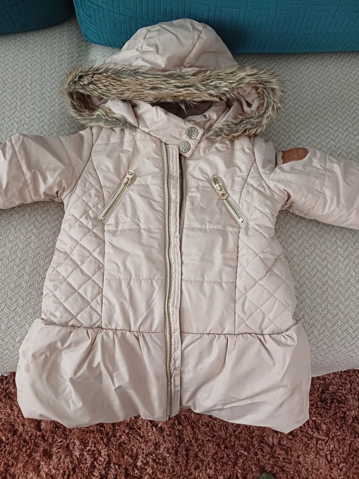 Bej renkli, kürklü kapüşonlu, fermuarlı cepli ve yumuşak sıcak kumaştan yapılmış kız montu. Rahat sokak stili için uygundur.