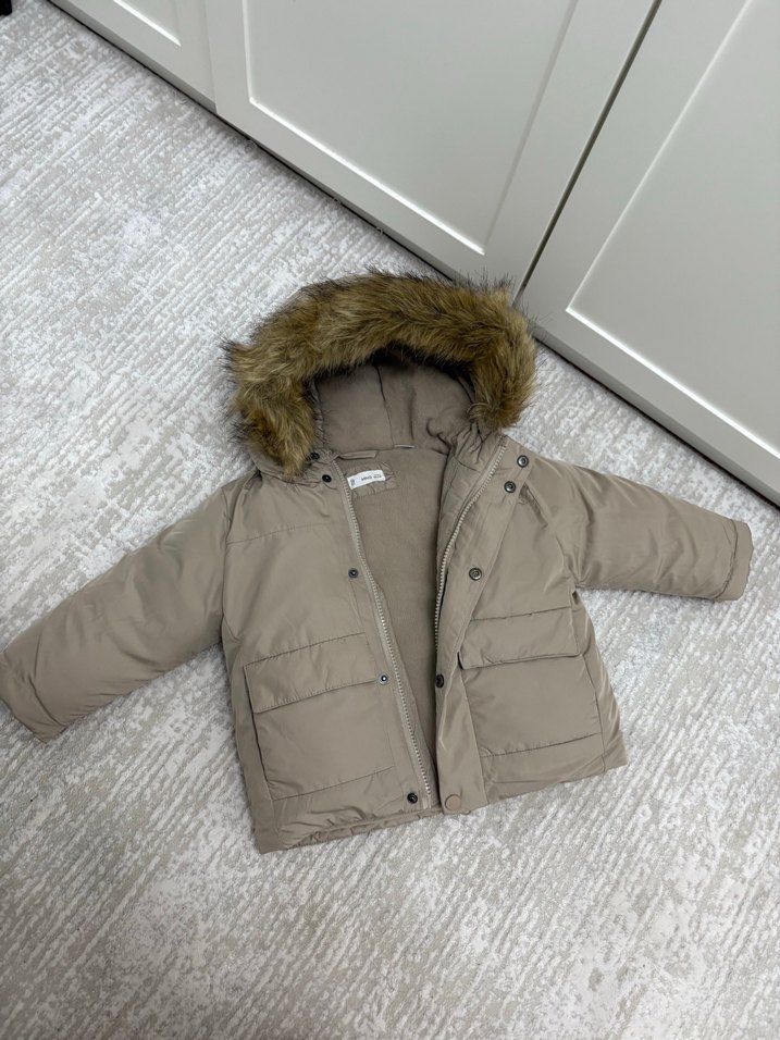 Kürklü kapüşonlu, regular fit bej mont. Yumuşak ve sıcak kumaştan, cepli ve notched lapel yakalıdır. Kürk detayı çıkarılabiliyor. Unisex model. Bir kere giyildi. Sorunsuzdur.