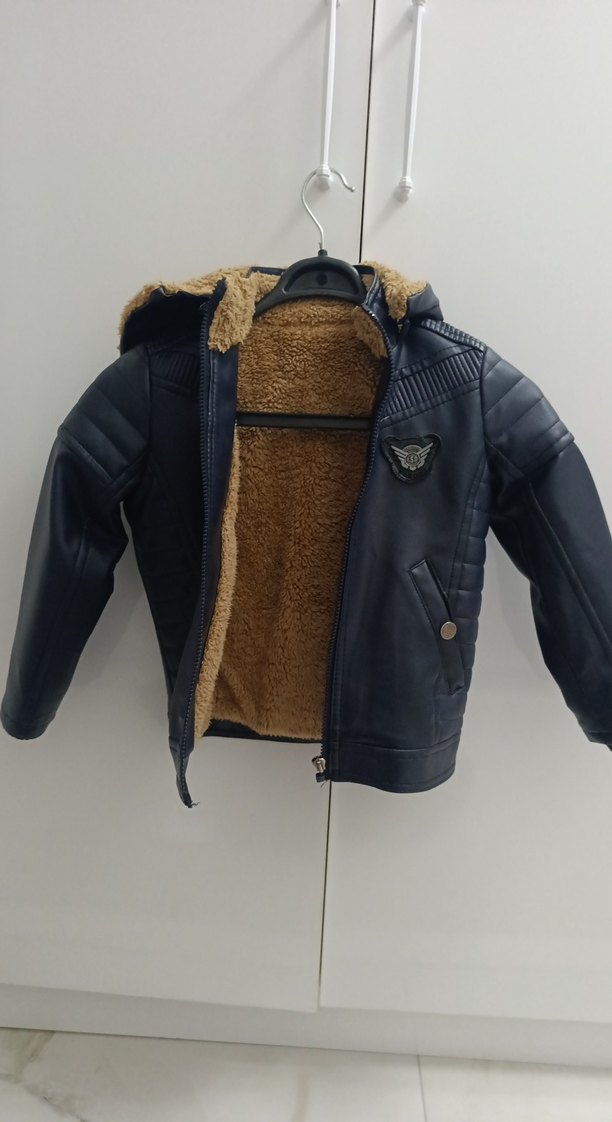 Koyu kahverengi deri, kürklü iç astar ve yaka detaylı, biker tarzı, trend bir erkek çocuk montu. Sıcak tutan yumuşak iç yüzeye sahiptir.