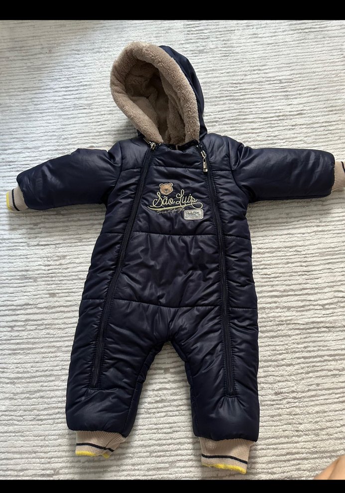 Kürklü kapüşonlu, koyu mavi renkli erkek bebek kar tulumu. Sokak tarzında, desensiz ve yumuşak, sıcak kumaştan üretilmiştir. ❄️