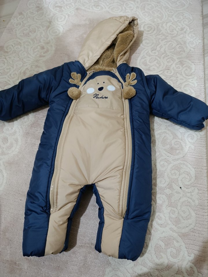 Kürklü detaylara ve baskılı desene sahip, kapüşonlu ve fermuarlı erkek bebek tulumu. Soğuk havalar için uygun, sokak giyimine uygun.