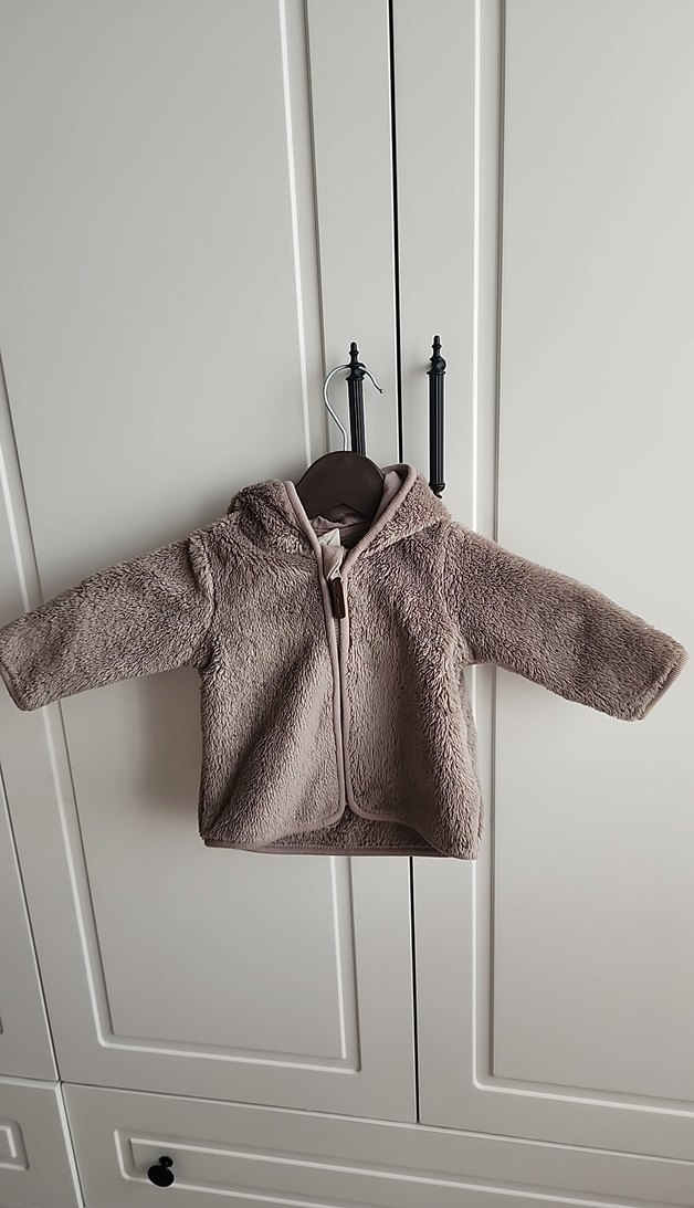 Düz kahverengi renkte, kapüşonlu, fermuarlı ve peluş detaylı, yumuşak, sıcak dokulu erkek çocuk montu. Kız da kullanabilir. Fitted kesim ve desensiz tasarım içerir. Sadece kapüşon kısmı ayı figürlüdür. Kullanılmış ama deformesizdir. 62 cm