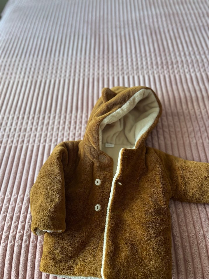 Kahverengi erkek çocuk kabanı, bol kesim ve yumuşak, sıcak kumaş ile kürk detaylıdır. Kapüşonlu ve düğmeli kapanışlıdır. Tertemizdir.