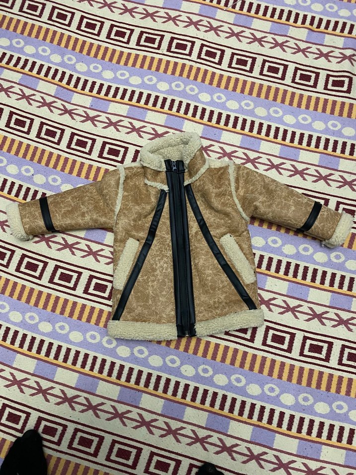 Kapüşonlu ve kürklü detaylara sahip, renkli desenli, yumuşak ve sıcak dokulu kahverengi erkek çocuk mont.