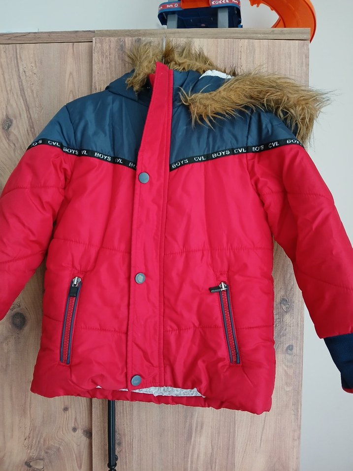 Kürklü kapüşonlu, kırmızı ve lacivert detaylı, yumuşak ve sıcak kumaştan yapılmış erkek çocuk montu. Fermuarlı cepleri ve düz modeliyle rahat bir sokak stili sunar.