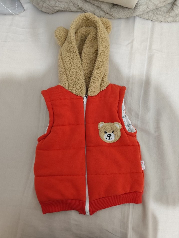Kırmızı renkli, kürklü kapüşonlu ve nakışlı ayı figürlü, erkek çocuk yeleği. İnce kesim ve yuvarlak yakalı, sokak tarzına uygun. turuncu renktir fotoğraf kırmızı çıkardı