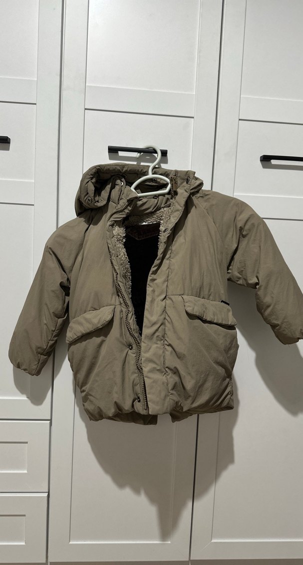 3-4 yaş, kürklü kapüşonlu, fitted kesim erkek çocuk mont. Yumuşak kumaştan, cepli ve desensiz sade tasarım.