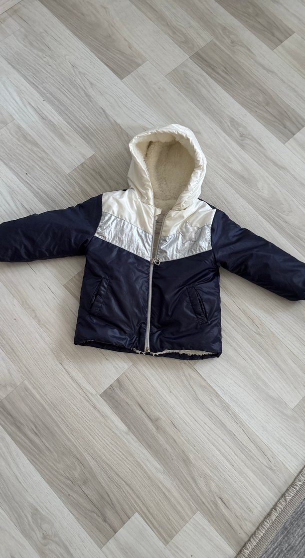 Erkek çocuk montu, kapüşonlu ve kürklü detaylıdır. Beyaz ve koyu renklerin birleşimiyle, içi yumuşak ve sıcaktır.
