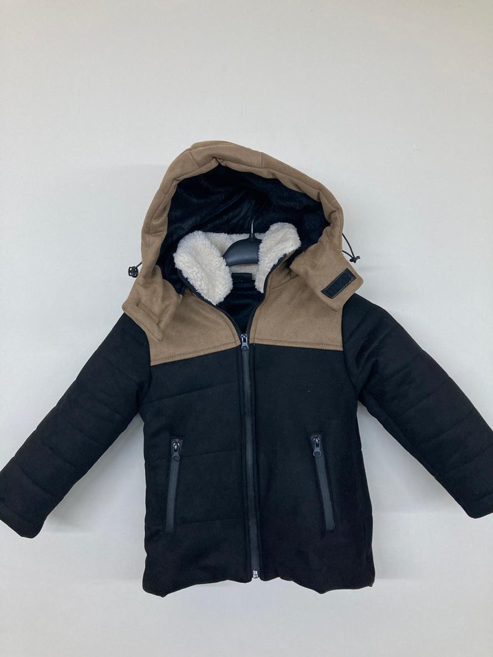 Kürklü kapüşon ve notched lapel yakaya sahip, fitted kesim erkek çocuk mont, koyu kahverengi ve siyah renklerde, streetwear tarzında.