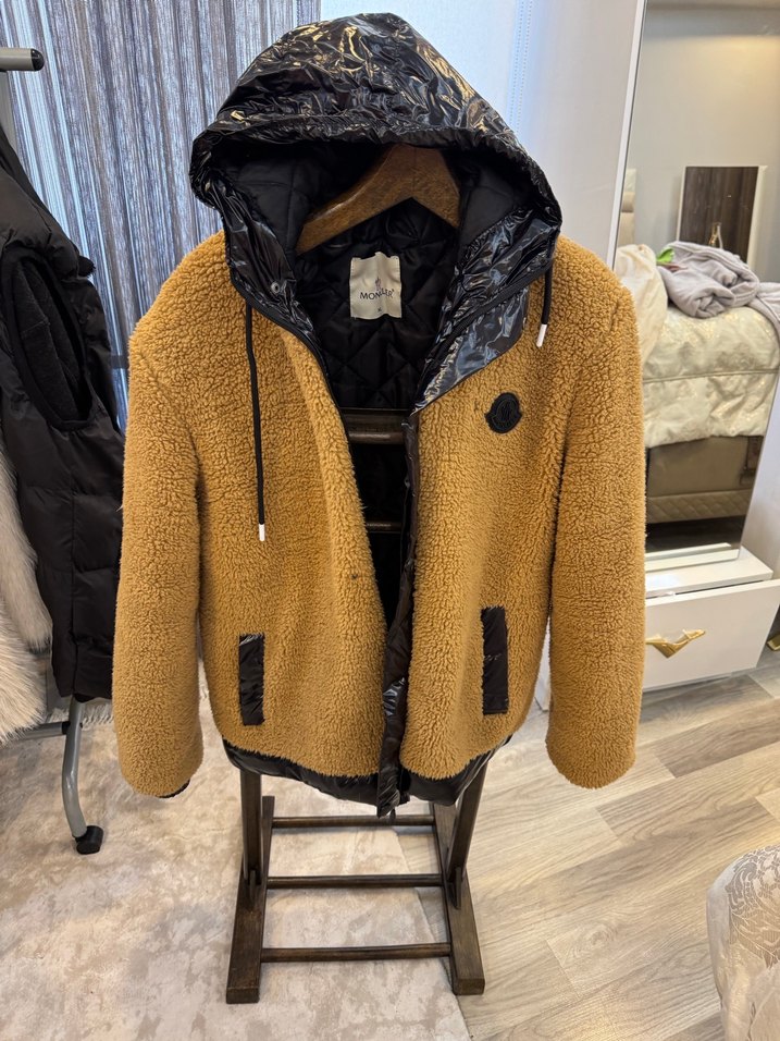Kahverengi yumuşak kumaş ve kürk detaylı, kapüşonlu, uzun kollu, kısa kesim, baskılı desenli erkek mont. Sokak stiline uygun ve fit kesim.