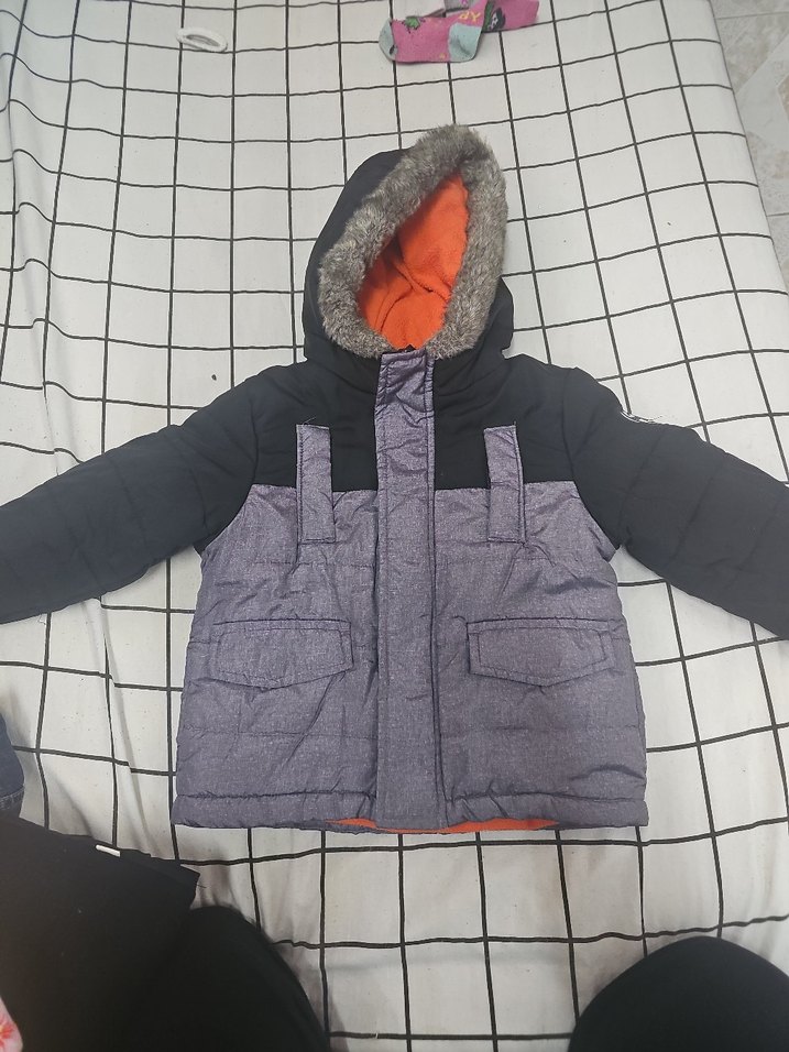 Kürklü kapüşonlu, notched lapel yakalı, gri renkli, sokak stilinde, erkek çocuk montu. Yumuşak ve sıcak kumaştan, rahat kesim. 2 yaş