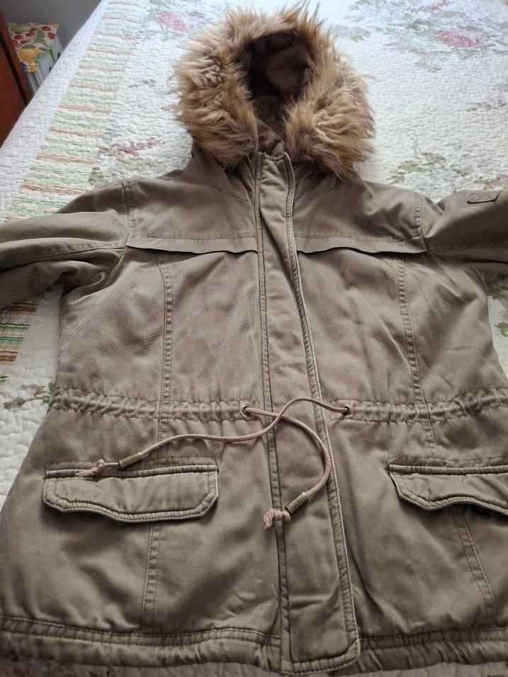 Kürklü kapüşonlu, uzun kollu, haki kadın mont. Önde cepler ve ayarlanabilir bel ipi bulunur. Rahat ve dış mekan kullanımına uygun. en 50cm boy 56 cm