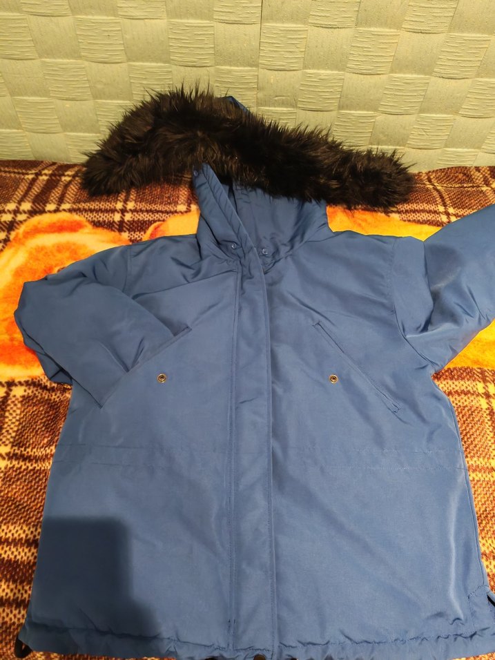 Kürklü kapüşonlu, uzun kollu koyu mavi midi uzunluğunda kadın kışlık mont. Rahat kesim ve yumuşak, sıcak kumaştan üretilmiştir. ️60 iki kol arası, 67 de boyu. orijinal