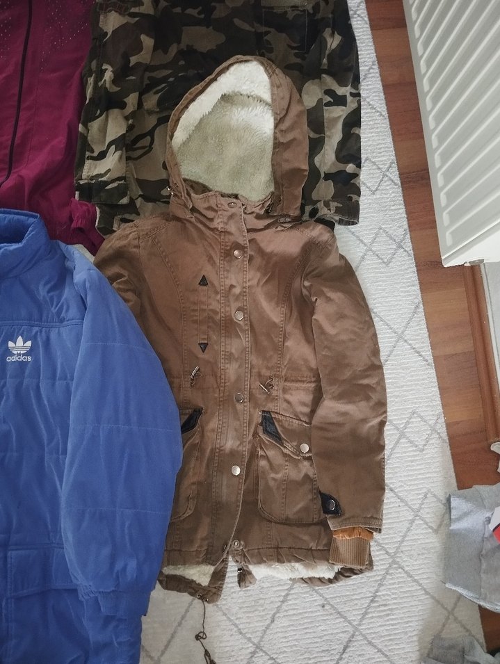 Kahverengi, kürklü kapüşonlu ve uzun kollu, yumuşak fleece kumaştan yapılmış, normal boyda kadın kışlık mont. Trendy casual sokak stiline uygun, rahat ve sıcak tutar.