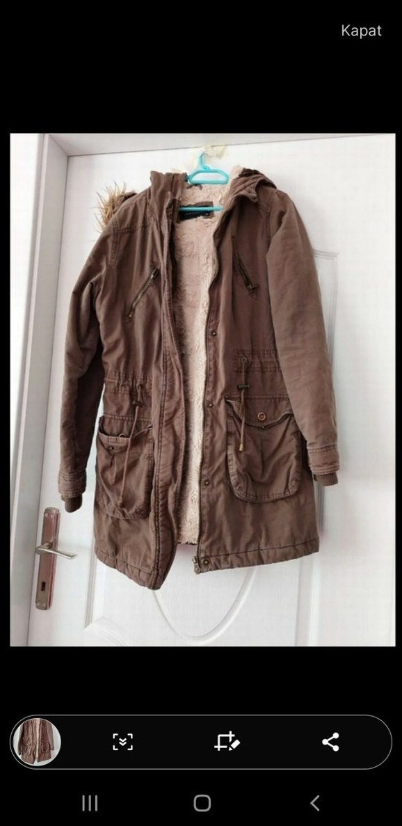 Kadınlar için uzun kollu, bol kesim süet mont İç kısmı kürklü ve kapüşonlu, çoklu ceplerle rahat ve günlük kullanıma uygun.