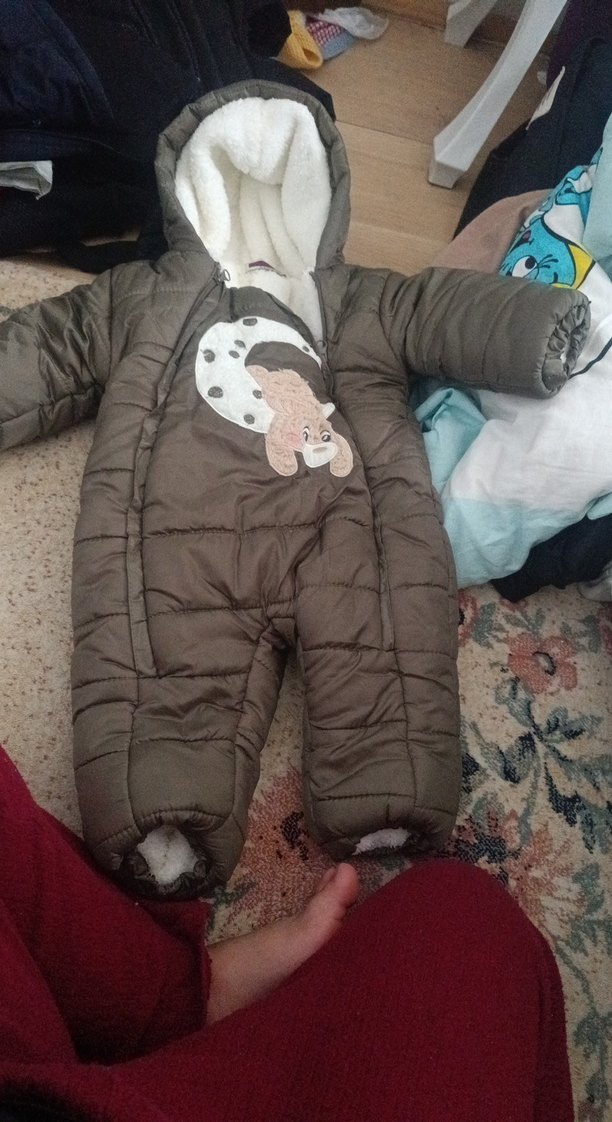 Yumuşak ve sıcak iç astarlı, kürklü kapüşonlu kahverengi bebek tulumu. Sevimli hayvan desenli, sokak tarzı için uygun.