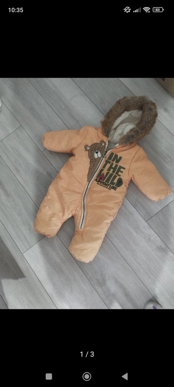 Kapüşonlu, kürklü kahverengi bebek tulumu. Baskılı ayı ve 'IN THE WILD ADVENTURE' yazılı. Yumuşak ve sıcak kumaş.