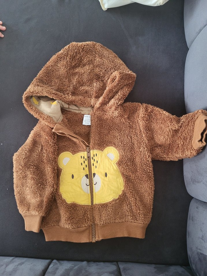 Kahverengi, yumuşak ve sıcak kumaştan yapılmış, kapüşonlu erkek çocuk ceketi. Önünde renkli ayı yüzü detayı bulunur, fermuarlı ve dar kesimlidir.