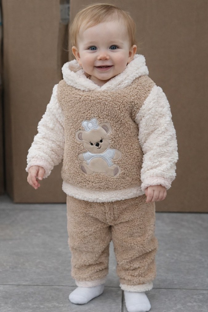 Kapüşonlu, yumuşak kürklü kahverengi kız bebek tulumu. Önünde nakışlı ayıcık deseni bulunur. Bu ürünler 9-12-18 ay bedenleri ile sifir üründür