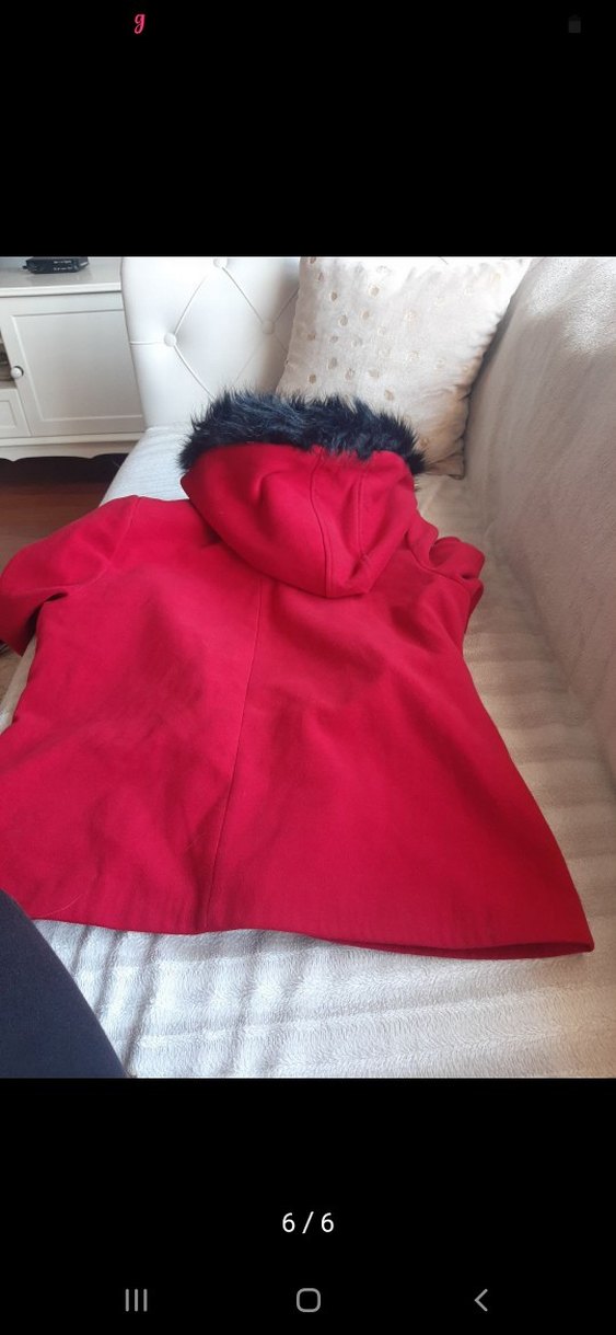Kürklü kapüşonlu, kırmızı midi kaban. Yumuşak ve sıcak dokulu, uzun kollu, rahat ve şık sokak stili için uygun.