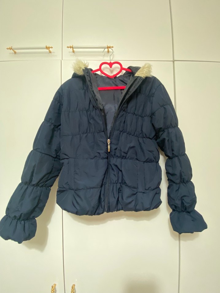Kürklü kapüşonlu, uzun kollu, kısa kesim, fitted kadın mont. Yumuşak ve sıcak kumaştan, koyu mavi renkte, dış mekan kullanımı için uygun. Trendy casual ve streetwear tarzına uygun. ❄️