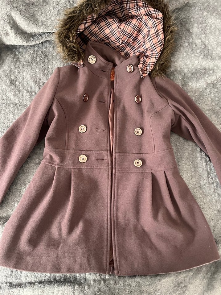 Kürklü kapüşon ve kesik yaka detaylı, yumuşak fleece kumaştan yapılmış kız çocuk kabandır. Düğmeli çift sıra tasarımı ve genişleyen etek ucu vardır.