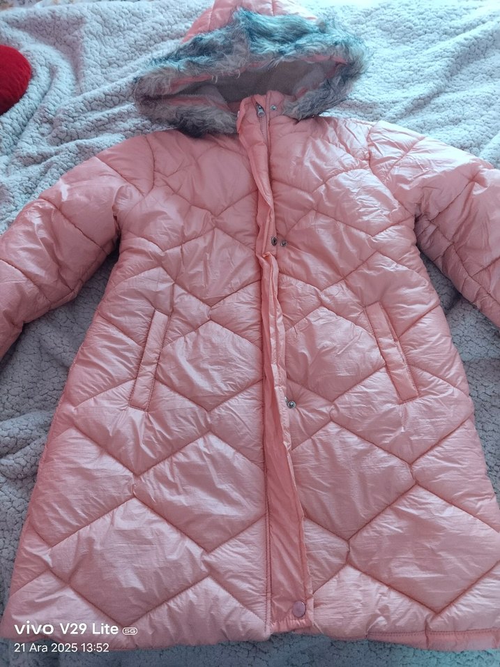 Pembe, kürklü kapüşonlu, yumuşak ve sıcak kumaştan yapılmış kız montu. Notch yaka ve pastel tonlarıyla rahat günlük sokak stili için uygun. ❄️