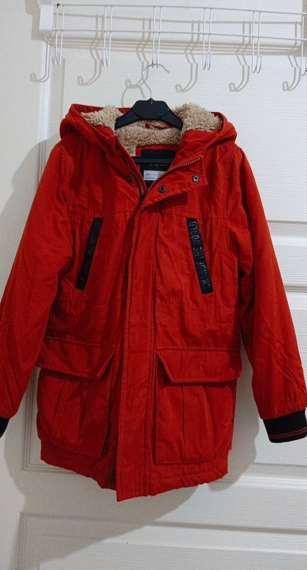 Koyu kırmızı renkte, kürklü kapüşon ve cepleri olan, bol kesim erkek mont. Sokak stiline uygun, yumuşak ve sıcak kumaştan yapılmıştır.