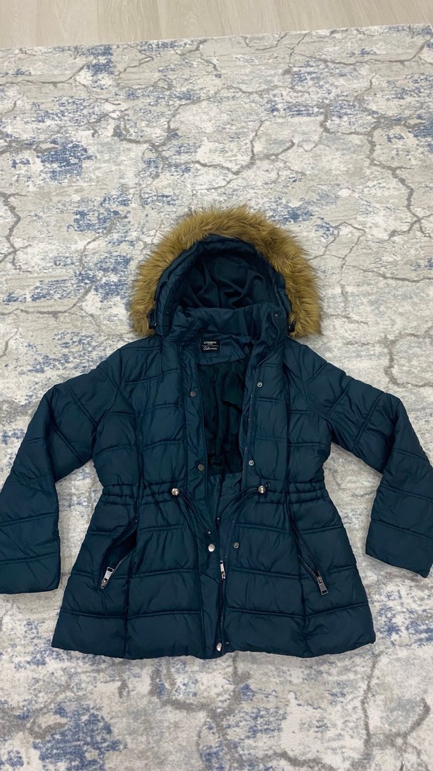 Fermuarlı cep detaylı, kapüşonlu ve kürklü lacivert kadın kış montu. Uzun kollu, belden oturan ve günlük kullanıma uygun. Defolu kısımları fotoğrafta belirtildi