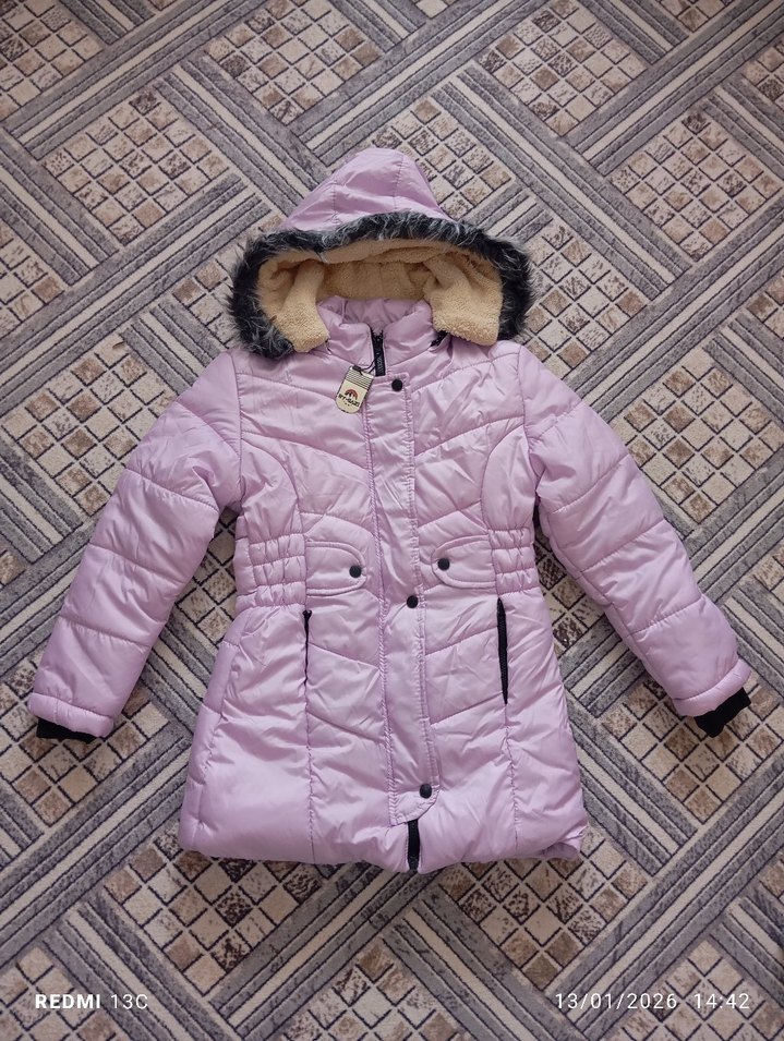 Kürklü kapüşonlü, lila renkli kız montu. Sokak stili için uygun, rahat ve sıcak tutar. sıfır etiketi üzerinde.