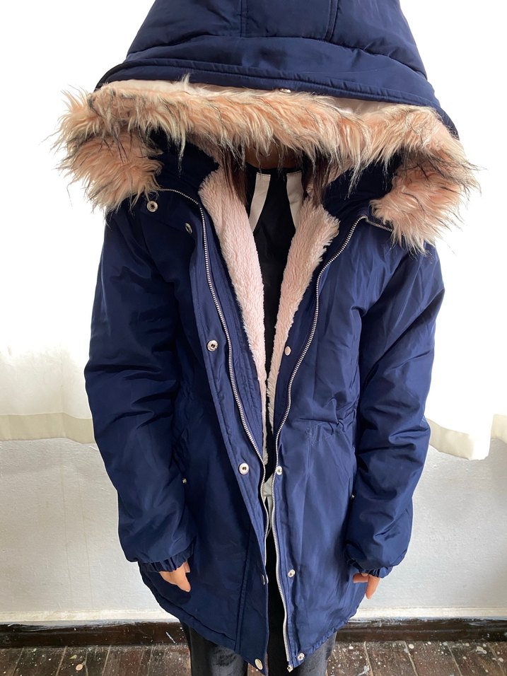 Kürklü kapüşonlu, koyu mavi renkli, fitted kesim kadın kış montu. Notch yaka ve askılı kollara sahip, yumuşak ve sıcak kumaştan midi boy dış giyim. ❄️ Beden 36 ancak daha büyük bir kalibi var.
