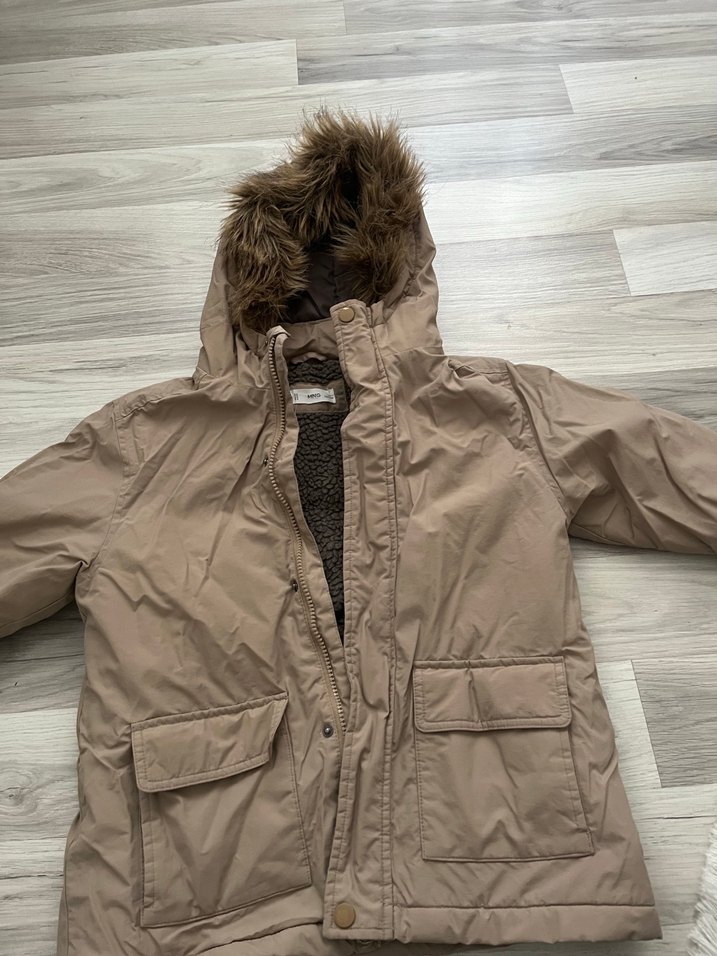 Kürklü kapüşonlu, bej renkli, erkek yada kız çocuk için dar kesim kaban. Yumuşak ve sıcak kumaştan, büyük ön ceplere sahip sade tasarım, sokak stili için uygun. Tertemızdır yırtık vs yoktur