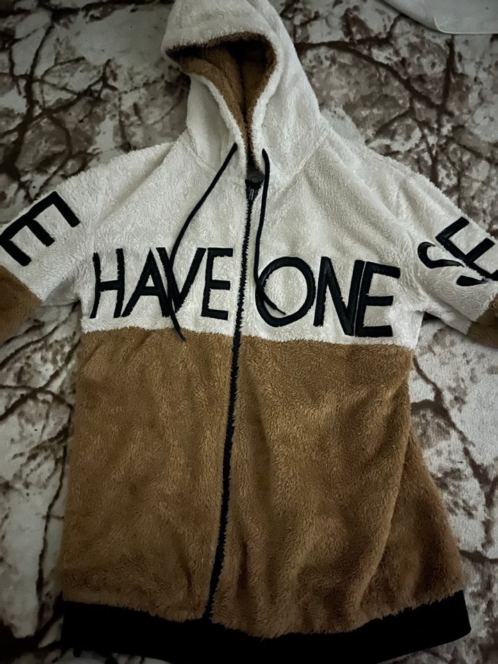 Kürklü detaylı, kapüşonlu ve uzun kollu bu kadın ceketi, bol kesim ve kısa boyda. Kahverengi ve beyaz renklerde, "HAVE/ONE" baskılı, rahat ve sıcak kumaştan yapılmıştır.