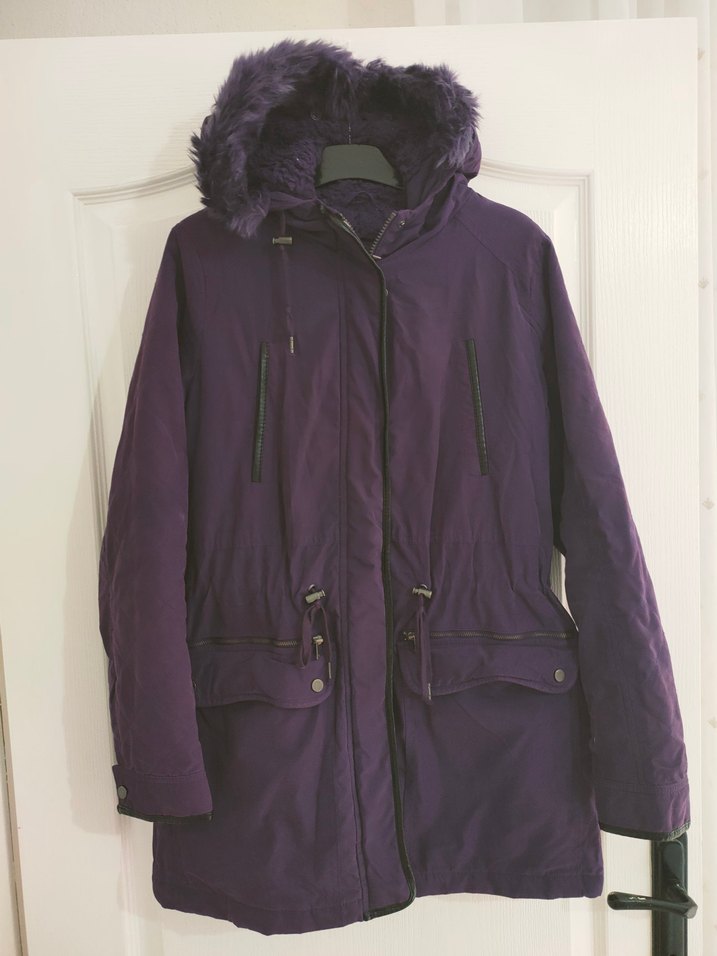 Mor, kürklü kapüşonlu, uzun kollu, normal boy, yumuşak ve sıcak kumaştan yapılmış, gençler için uygun, sokak stiline uygun, fit kesim kışlık kadın mont.