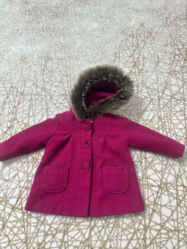 Mor renkli, kürklü kapüşonlu ve yumuşak kumaştan yapılmış kız çocuk kabanıdır. Düz tasarımlı ve ön ceplidir.