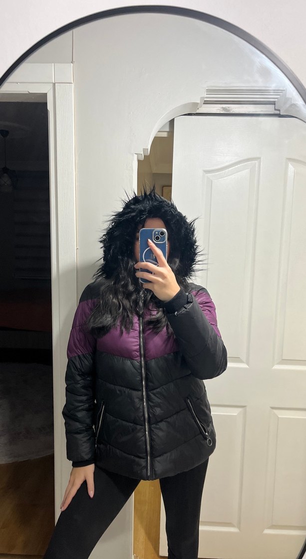 Kürklü Kapüşonlu Mor Siyah Kışlık Mont