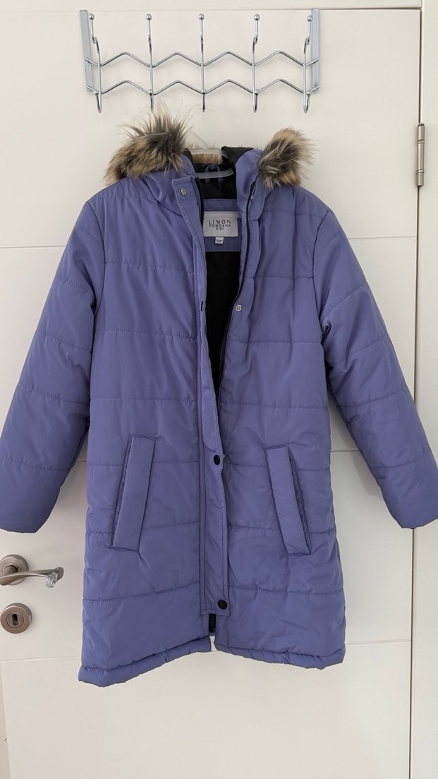 Mor renkli, kürklü kapüşonlu ve dik yaka detaylı, uzun kollu,rahat kesim mont.