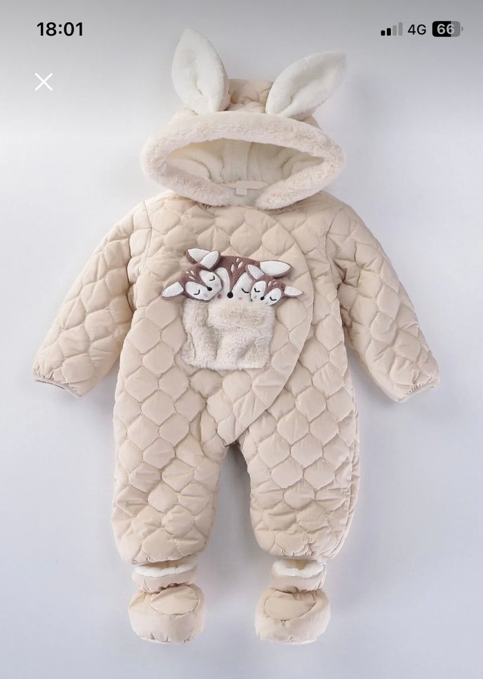 Kapüşonlu, kulak detaylı, nakışlı ve kürk detaylı bej bebek tulumu. Pastel tonlarda, kapitone deseni ve yumuşak iç astar içerir. Kızım kısa bir dönem giydi çok kalitelidir. 6-9 Aylık alınmıştır. Patiği hiç kullanılmadı beraberinde gönderilecektir.