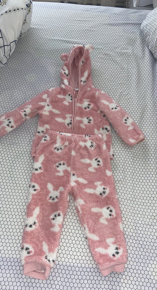 Pastel pembe renkte, kapüşonlu ve kürklü detaylı bebek kız tulumu. Tavşan desenleri ile yumuşak ve sıcak kumaştan üretilmiştir.