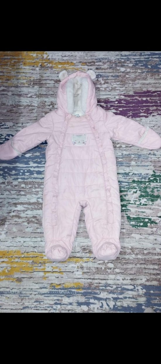 Pastel pembe renkte, kürklü kapüşonlu ve yumuşak sıcak kumaştan yapılmış bebek tulumu. Desensiz tasarımı, eldiven ve ayak koruyucuları bulunur.