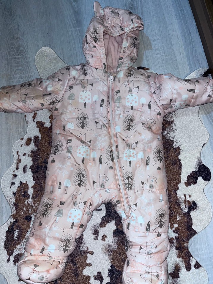 Pastel pembe renkte, kürklü kapüşonlu ve sevimli desenli bebek tulumu. Sıcak tutmak için uygundur. ❄️
