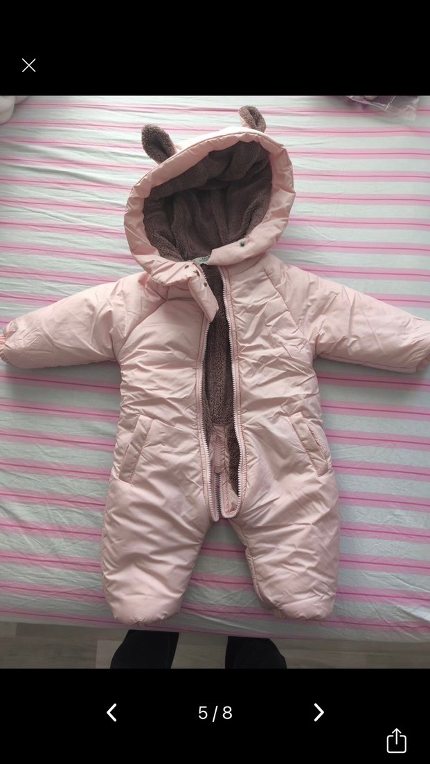 Pastel pembe renkte, kapüşonlu ve kürklü detaylı bebek tulumu. Düz deseni ve yumuşak iç kısmı ile sıcak tutar.