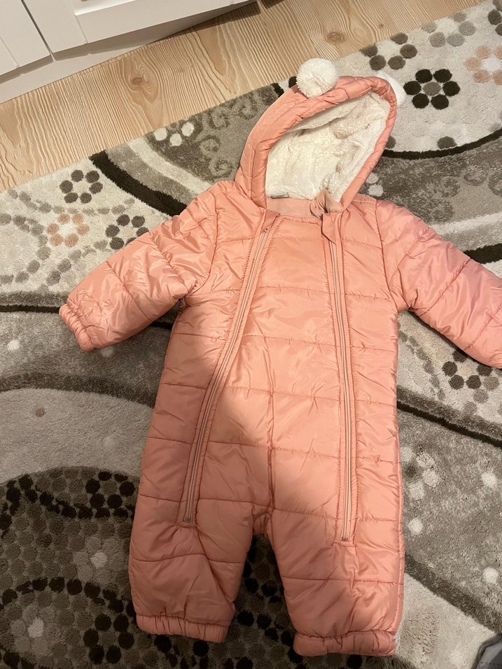 Pastel pembe, kapüşonlu ve kürklü detaylı bebek tulumu. Yumuşak dokulu, çift fermuarlı ve sıcak tutar. ❄️