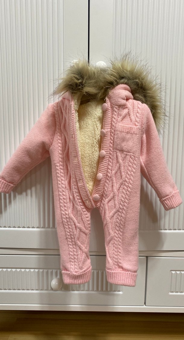 Kürklü kapüşonlu, notched lapel yakalı, pastel pembe renkli bebek tulumu. İç kısmı yumuşak ve sıcak dokulu, örgü detaylıdır. ❄️ ürün hiç kullanılmadı