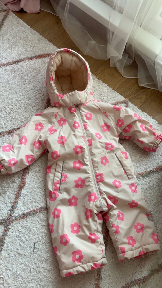 Pastel pembe renkli, çiçek desenli bebek tulumu, kürklü detaylı kapüşon ve notched lapel yakaya sahiptir. ❄️